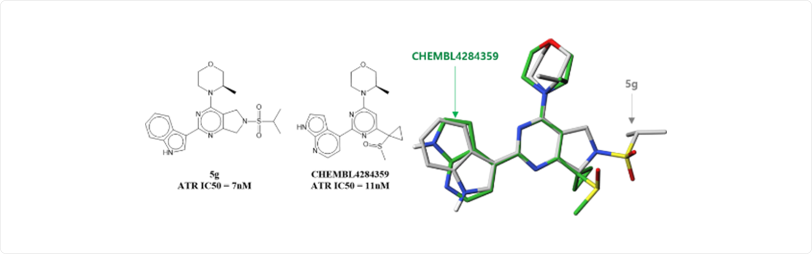 DeepZema® offers two different approaches for prediction of targets, i.e., conformal prediction and 3D shape matching methods. Compound 5g is an ATK kinase inhibitor with IC50 of 7nM (BMCL 2022, 128651). Conformal prediction on this compound gives mTOR and ATR as plausible targets. On the other hand, 3D shape alignment of 5g to known kinase inhibitor library resulted in a list of kinases such as mTOR, PI3K, CLK4, MAPK1 and ATR kinases. Target prediction may be used for identifying targets of phenotypic screening hits or for identifying off-targets of given compounds.