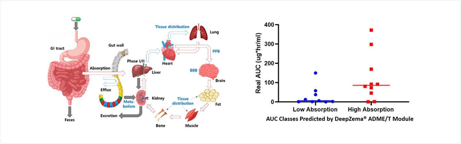 ML and deep learning-based models for a variety of ADME properties as well as toxicity endpoints are available in DeepZema®. For example, DeepZema® implements (1) absorption (oral BA, HIA, Pgp inhibition/substrate, MDCK permeability, skin penetration), (2) distribution (BBB penetration, PPB), (3) metabolism (Cyp inhibition) and (4) Excretion (Clint, metabolic stability, half life).